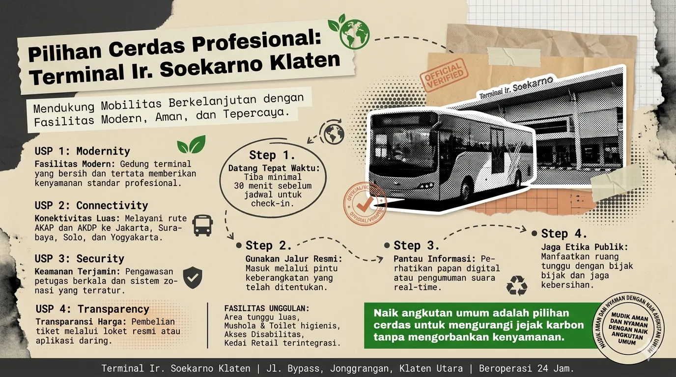 Terminal Tipe A Ir. Soekarno Klaten menegaskan komitmennya sebagai kawasan Zona Integritas yang berorientasi pada pelayanan publik yang bersih dan transparan. Status ini menunjukkan bahwa seluruh proses pelayanan di terminal dilaksanakan dengan mengedepankan prinsip bebas korupsi, akuntabel, dan profesional. Masyarakat yang datang diharapkan dapat merasakan layanan yang adil, cepat, serta tanpa pungutan liar.